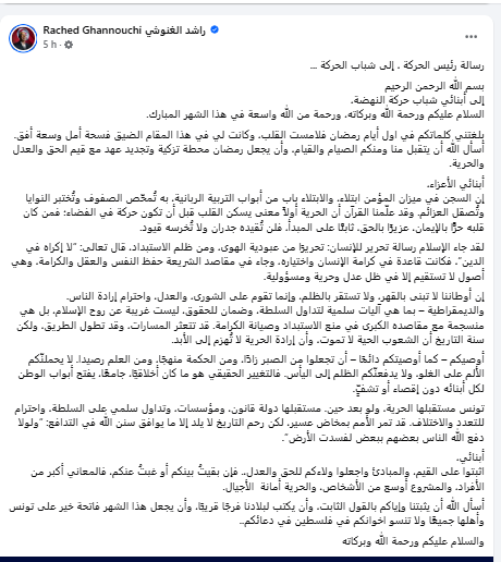 شدد رئيس حركة النهضة، راشد الغنوشي، في رسالة وجهها من سجنه، إلى أبناء الحركة، ونشرت عبر صفحته الرسمية، اليوم الأحد 22 فيفري 2026، على أنّ "تونس مستقبلها الحرية، ولو بعد حين. مستقبلها دولة قانون، ومؤسسات، وتداول سلمي على السلطة، واحترام للتعدد والاختلاف" .