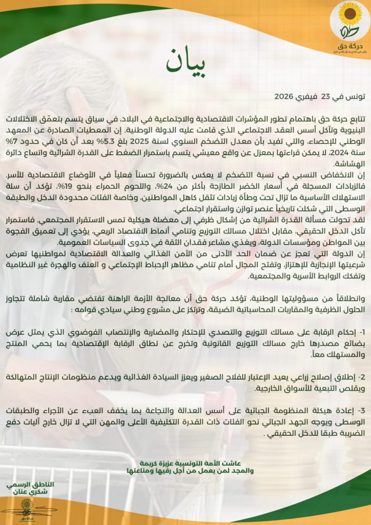 وأشارت الحركة في بيان لها أمس الإثنين 24 فيفري 2026، الى أن المعطيات الصادرة عن المعهد الوطني للإحصاء، والتي تفيد بأن معدل التضخم السنوي لسنة 2025 بلغ 5.3% بعد أن كان في حدود 7% سنة 2024، لا يمكن قراءتها بمعزل عن واقع معيشي يتسم باستمرار الضغط على القدرة الشرائية واتساع دائرة الهشاشة، معتبرة أن مسألة القدرة الشرائية تحولت من إشكال ظرفي إلى معضلة هيكلية تمس الاستقرار المجتمعي، فاستمرار تآكل الدخل الحقيقي، مقابل اختلال مسالك التوزيع وتنامي أنماط الاقتصاد الريعي، يؤدي إلى تعميق الفجوة بين المواطن ومؤسسات الدولة، ويغذي مشاعر فقدان الثقة في جدوى السياسات العمومية.