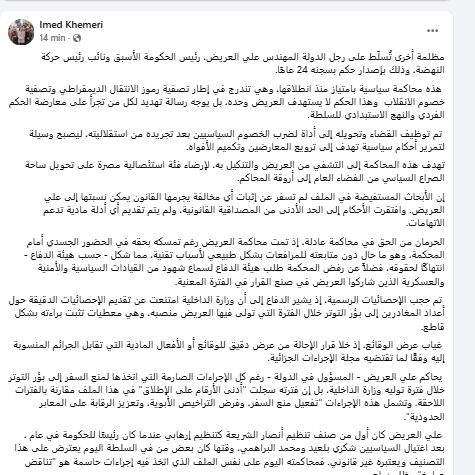 اعتبر القيادي بحركة النهضة عماد الخميري أن الحكم ب24 سنة سجنا في حق علي العريض، رئيس الحكومة الأسبق ونائب رئيس حركة النهضة يمثل مظلمة وهو رسالة تهديد لكل من تجرأ على معارضة الحكم الفردي والنهج الاستبدادي للسلطة، وفق تعبيره.