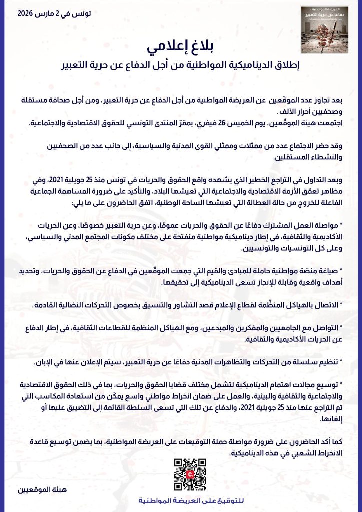 وأوضح، بيان التأسيس الديناميكية المواطنية من أجل الدفاع عن حرية التعبير، أن هيئة الموقّعين اجتمعت، الخميس 26 فيفري 2026، بمقرّ المنتدى التونسي للحقوق الاقتصادية والاجتماعية، حيث حضر عدد من ممثلات وممثلي القوى المدنية والسياسية، إلى جانب عدد من الصحفيين والنشطاء المستقلين.