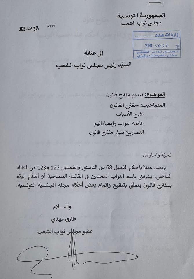 تقدّم عدد من نواب البرلمان التونسي، بمقترح قانون يرمي إلى تنقيح وإتمام بعض أحكام مجلة الجنسية التونسية، في اتجاه تشديد شروط إسناد الجنسية وإدراج آليات جديدة تراعي ما اعتبروه “المصلحة العليا للدولة ومتطلبات الأمن والسلم الاجتماعي”.