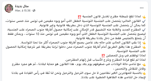 شددت على أن الغاية من المقترح الجديد هو التضييق قدر الإمكان على إمكانية حصول أفارقة جنوب الصحراء على الجنسية، ليصبح الحصول على الجنسية التونسية للطفل من والدين مقيمين في تونس منذ 10 سنوات، ويمكن أن يتمتع بالتجنيس فقط من دخل بلادنا بطريقة قانونية”.