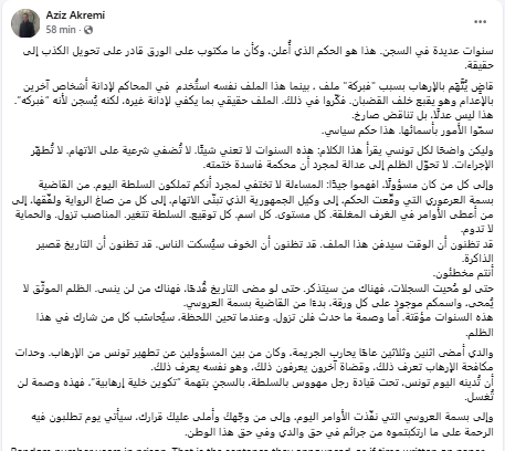 أشار عزيز العكرمي إلى أن والده أمضى اثنين وثلاثين عامًا يحارب الجريمة،” وكان من بين المسؤولين عن تطهير تونس من الإرهاب. وحدات مكافحة الإرهاب تعرف ذلك، وقضاة آخرون يعرفون ذلك، وهو نفسه يعرف ذلك”، وفق نص التدوينة.