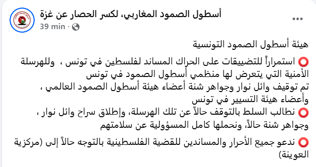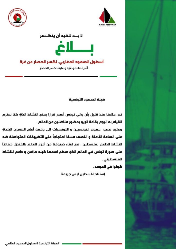 وسبق أن أعلنت هيئة أسطول الصمود العالمي مساء يوم الأربعاء، صدور قرار بمنعها من القيام بحفل تكريمي بميناء سيدي بوسعيد رغم أنّ الفعالية كانت مبرمجة في إطار اجتماع اللجنة العالمية لأسطول الصمود وبموافقات أولية من السلط المعنية.