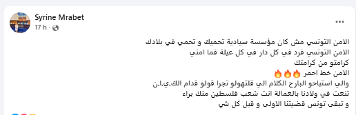 وتابعت مرابط في تدوينة نشرتها على صفحتها بالفيسبوك: الأمن خط أحمر “تبقى تونس قضيتنا الأولى وقبل كل شيء”.