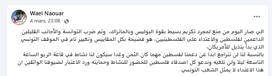 في المقابل اعتبر وائل نوار أن الإعتداء على التونسيين والأجانب القليلين الداعمين لفلسطين والاعتداء على الفلسطينيين،يمثل فضيحة بكل المقاييس وتغيير تام في الموقف التونسي الذي بدأ يتذيل للأمريكان، وفق تعبيره.