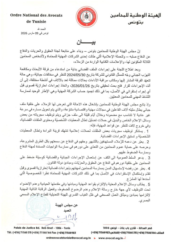 وعبّرت عن دعمها للمحامين المستهدفين بالتشهير وحقهم في الدفاع عن سمعتهم بكل الطرق المشروعة. وحرصه على حماية عموم المحامين من التعدي على دورهم في ممارسة الواجبات المسندة لمهنة الدفاع وممارسة الضغوط عليهم.