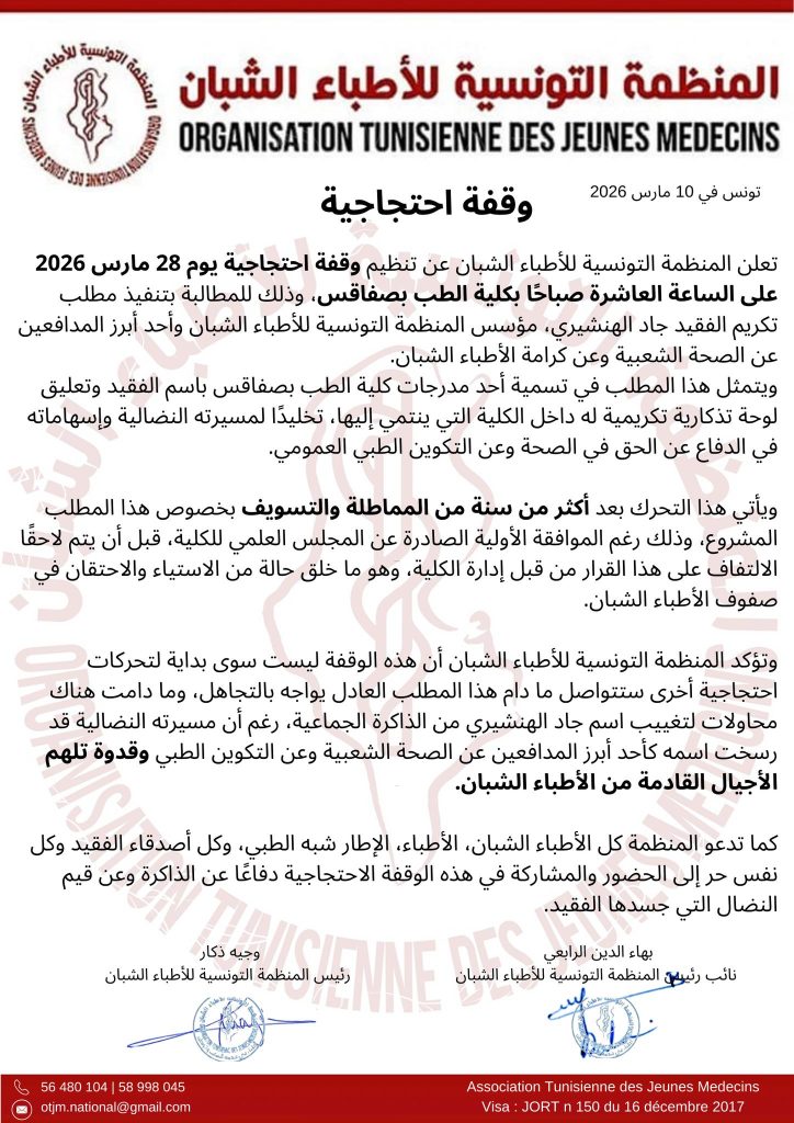 وأشارت المنظمة إلى أنها قرّرت تنفيذ هذا التحرك بعد أكثر من سنة من “المماطلة والتسويف” بخصوص هذا المطلب المشروع، رغم الموافقة الأولية الصادرة عن المجلس العلمي للكلية، قبل أن يتم لاحقا “الالتفاف” على هذا القرار من قبل إدارة الكلية، وهو ما خلق حالة من الاستياء والاحتقان في صفوف الأطباء الشبان، وفق نص البيان.