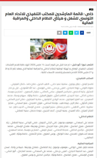انتهت يوم السبت 14 مارس 2026 فترة تقديم الترشحات للمكتب التنفيذي الوطني للاتحاد العام التونسي للشغل، وللهيئة الوطنية للنظام الداخلي وهيئة المراقبة المالية، استعدادًا لعقد مؤتمر المنظمة أيام 25 و26 و27 مارس 2026 بمدينة المنستير، وفق موقع “الشعب نيوز” التابعة للاتحاد العام التونسي للشغل.
