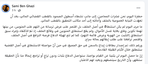 وتابع في تدوينة نشرها على صفحته بالفيسبوك: إنّ ما حصل اليوم لن يثنينا عن القيام بواجبنا. سنواصل الدفاع بثبات ودون تراخٍ أو تراجع، إيمانًا منا بأنّ الحقيقة ستظهر، وأنّ التاريخ سينصفهم ويعيد لهم الاعتبار.