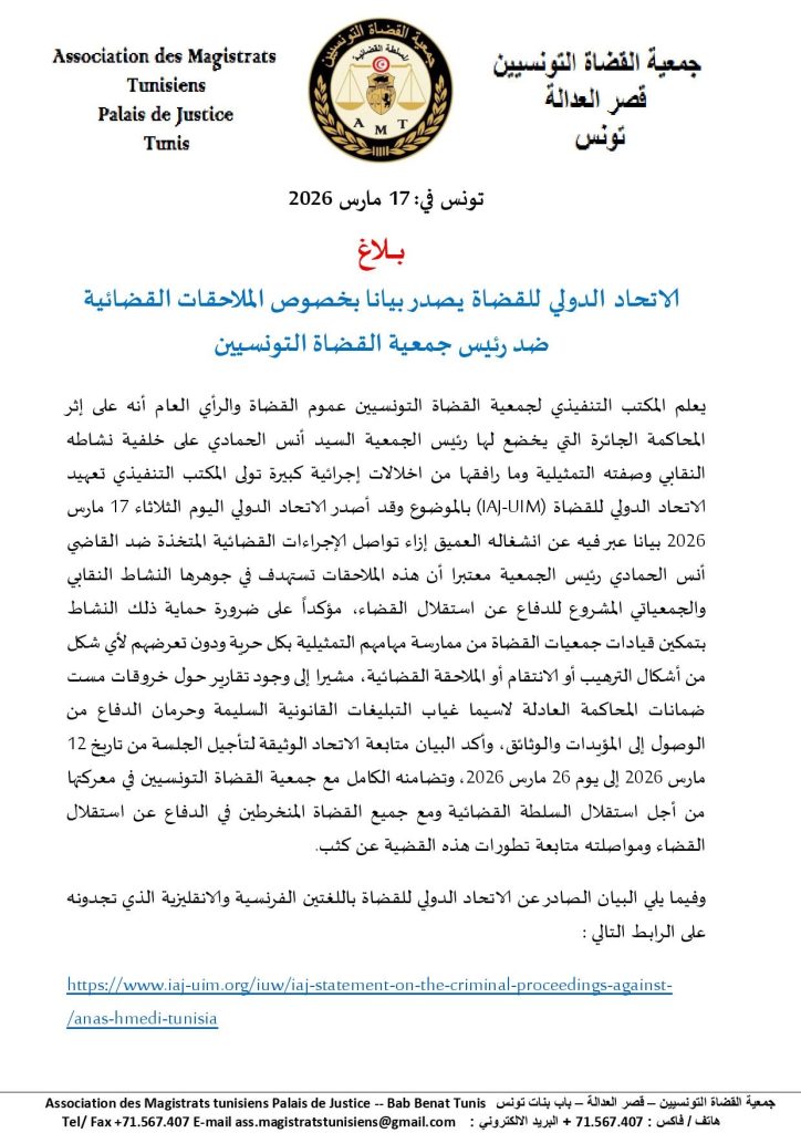 وأكد البيان متابعة الاتحاد الوثيقة لتأجيل الجلسة من تاريخ 12 مارس 2026 إلى يوم 26 مارس 2026، وتضامنه الكامل مع جمعية القضاة التونسيين في معركتها من أجل استقلال السلطة القضائية ومع جميع القضاة المنخرطين في الدفاع عن استقلال القضاء ومواصلته متابعة تطورات هذه القضية عن كثب.