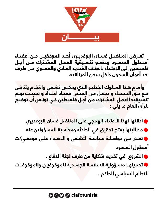 وكانت تنسيقيّةُ العمل المشترك من أجل فلسطين، قد عبرت في بيان سابق لها اليوم الاربعاء 18 مارس 2026، عن استنكارها لما أقدمت عليه السلطات يوم الإثنين، بتاريخ 16 مارس 2026، من إصدار بطاقات إيداع بالسجن في حقّ كلٍّ من أعضاء التنسيقية وهيئة الأسطول المغاربي: جواهر شنّة، سناء المسهلي، وائل نوار، غسان الهنشيري، وغسان البوغديري، إضافة إلى عضوي هيئة الأسطول المغاربي نبيل الشنوفي ومحمد أمين بالنور، مطالبة بالإفراج الفوري وغير المشروط عنهم.