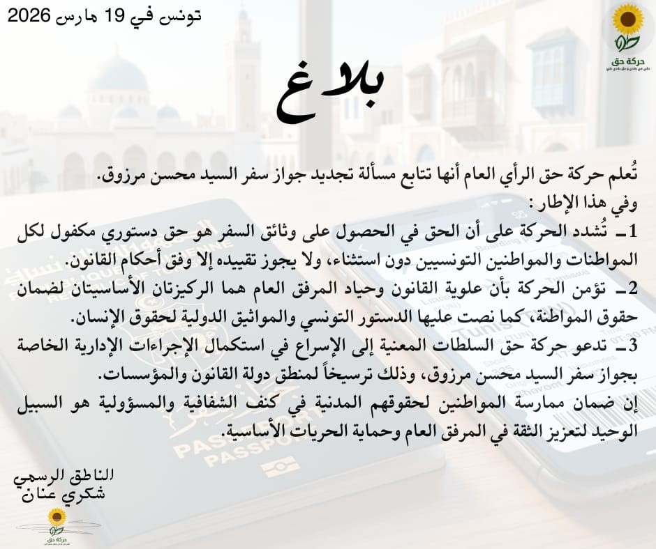 وشددت الحركة في بيان لها، على أن الحق في الحصول على وثائق السفر هو حق دستوري مكفول لكل المواطنات والمواطنين التونسيين دون استثناء، ولا يجوز تقييده إلا وفق أحكام القانون.