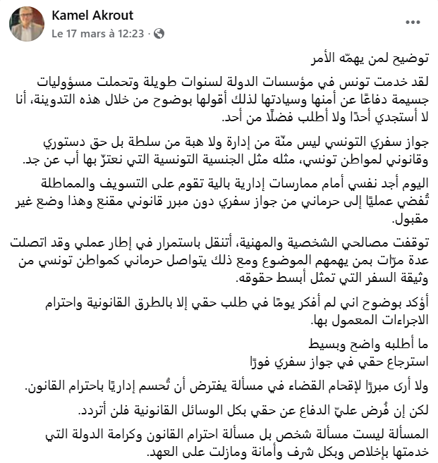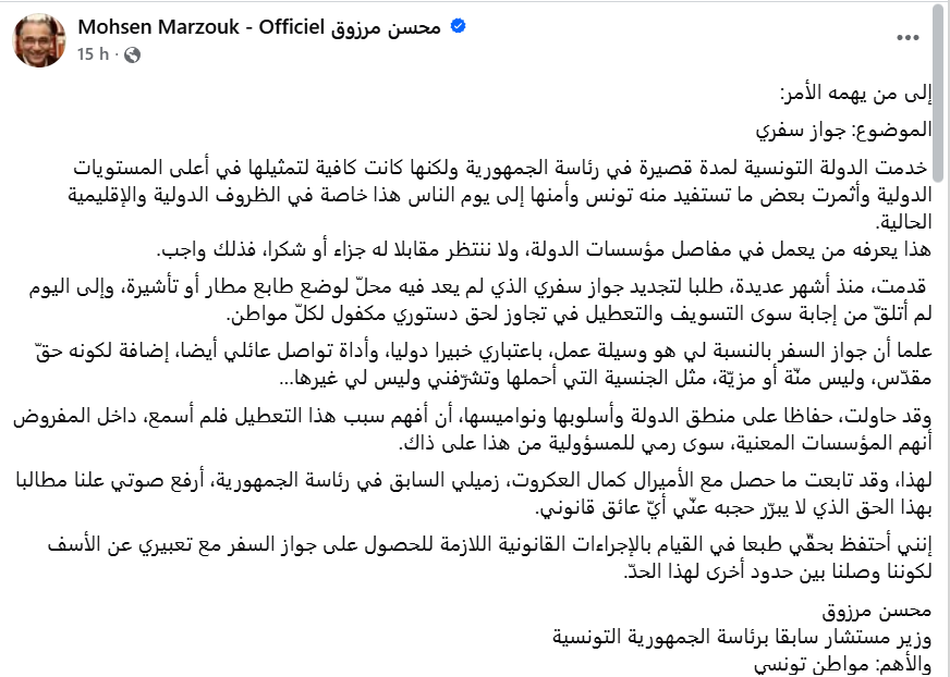 ونشر أمس الإربعاء محسن مرزوق، تدوينة على صفحته الرسمية على الفايسبوك، أكد من خلالها تقدمه بطلب لتجديد جواز سفره منذ أشهر عديدة لكنه لم يتلقى سوى “التسويف والتعطيل”.