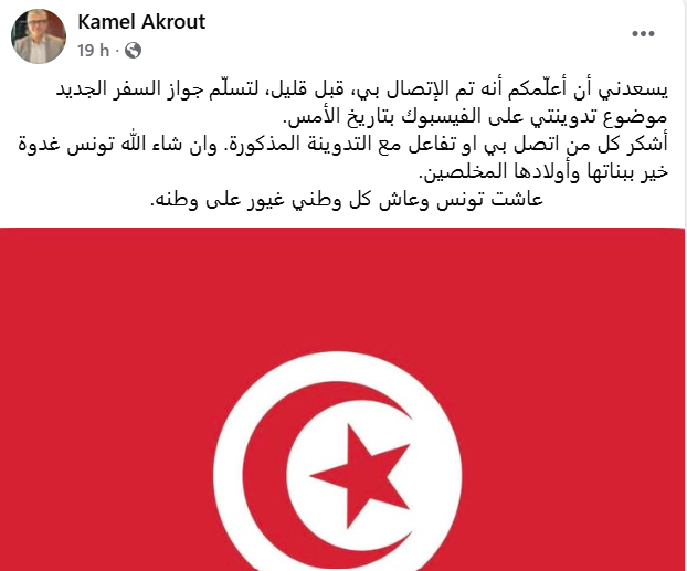 وكان الأميرال كمال العكروت قد أعلن الاربعاء أنه قد تم الاتصال به لتسلم جواز سفره بعد تعرضه الى تعطيل اداري دون الحصول على جواز سفره.