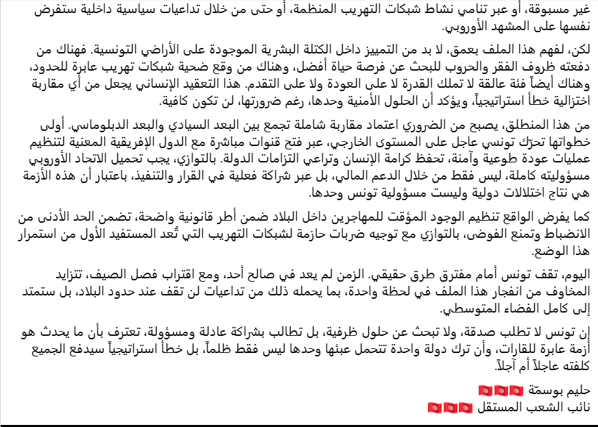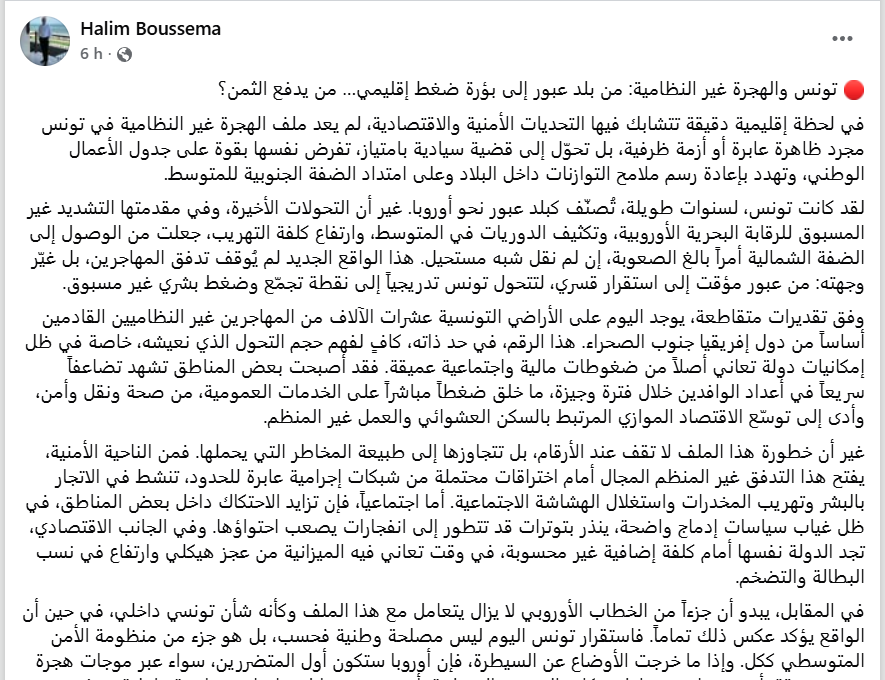 وختم بوسمة بالقول “إن تونس لا تطلب صدقة، ولا تبحث عن حلول ظرفية، بل تطالب بشراكة عادلة ومسؤولة، تعترف بأن ما يحدث هو أزمة عابرة للقارات، وأن ترك دولة واحدة تتحمل عبئها وحدها ليس فقط ظلماً، بل خطأ استراتيجياً سيدفع الجميع كلفته عاجلاً أم آجلاً”.