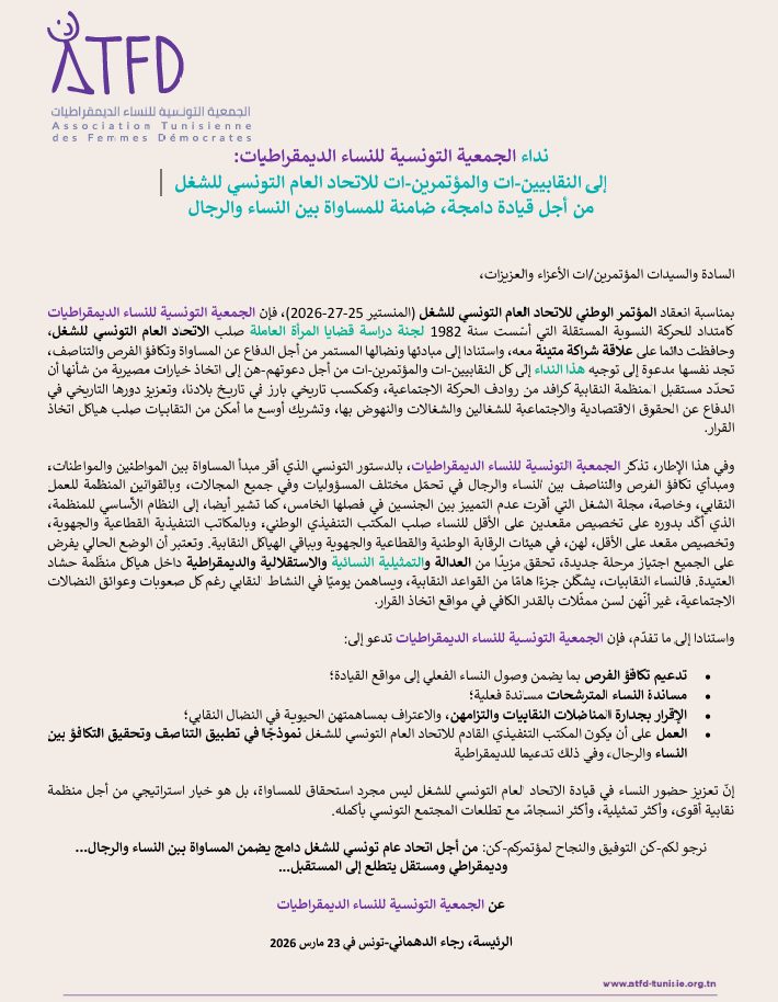 واعتبرت جمعية النساء الديمقراطيات أن تعزيز حضور النساء في قيادة الاتحاد العام التونسي للشغل ليس مجرد استحقاق للمساواة، بل هو خيار استراتيجي من أجل منظمة نقابية أقوى، وأكثر تمثيلية، وأكثر انسجاما مع تطلعات المجتمع التونسي بأكمله.