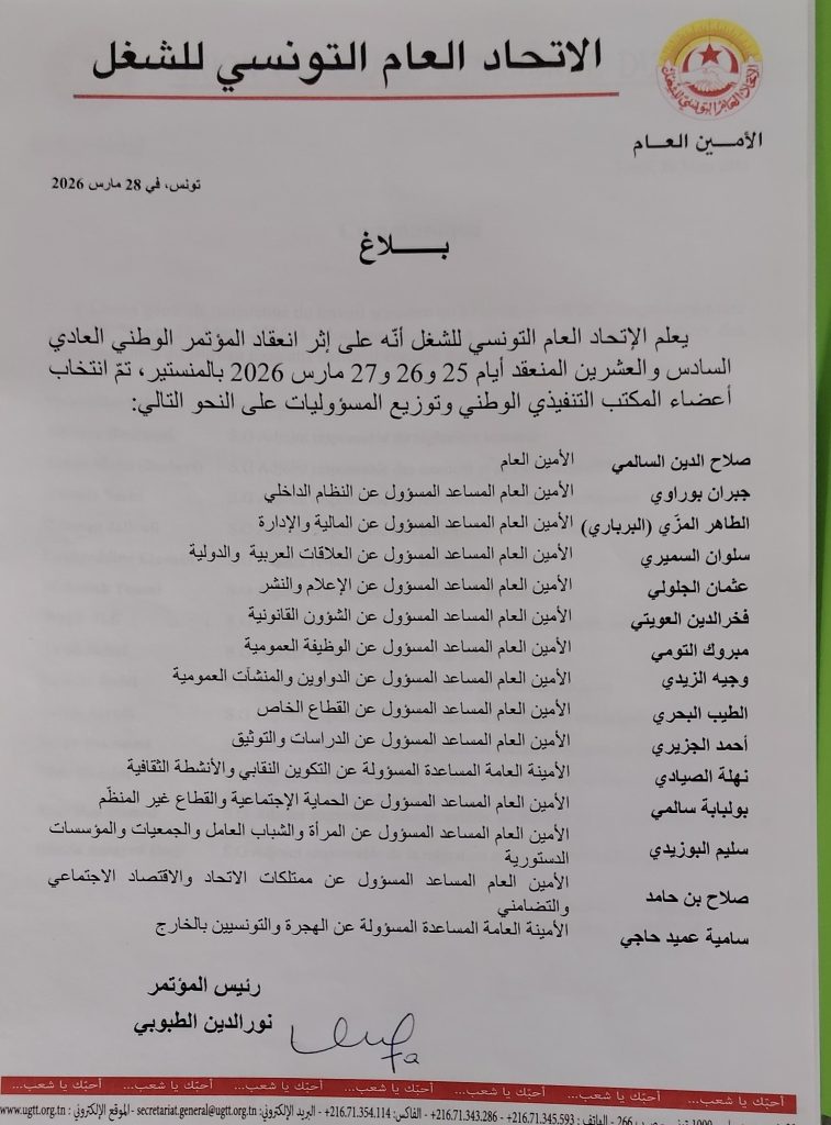 اجتمع المكتب التنفيذي للاتحاد العام التونسي المنتخب خلال المؤتمر العادي للاتحاد المنعقد من 25 إلى 27 مارس 2026 بمدينة المنستير