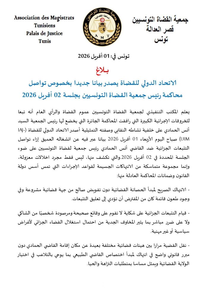 ودعا المكتب التنفيذي القضاة والمحامين وكافة مكونات المجتمع للحضور بكثافة يوم غد الخميس 02 أفريل 2026 بقصر العدالة بتونس لمواكبة محاكمة رئيس جمعية القضاة التونسيين التي تتزامن مع جلسة النظر في الطعون في التنابيه الموجهة للجمعية من رئاسة الحكومة.