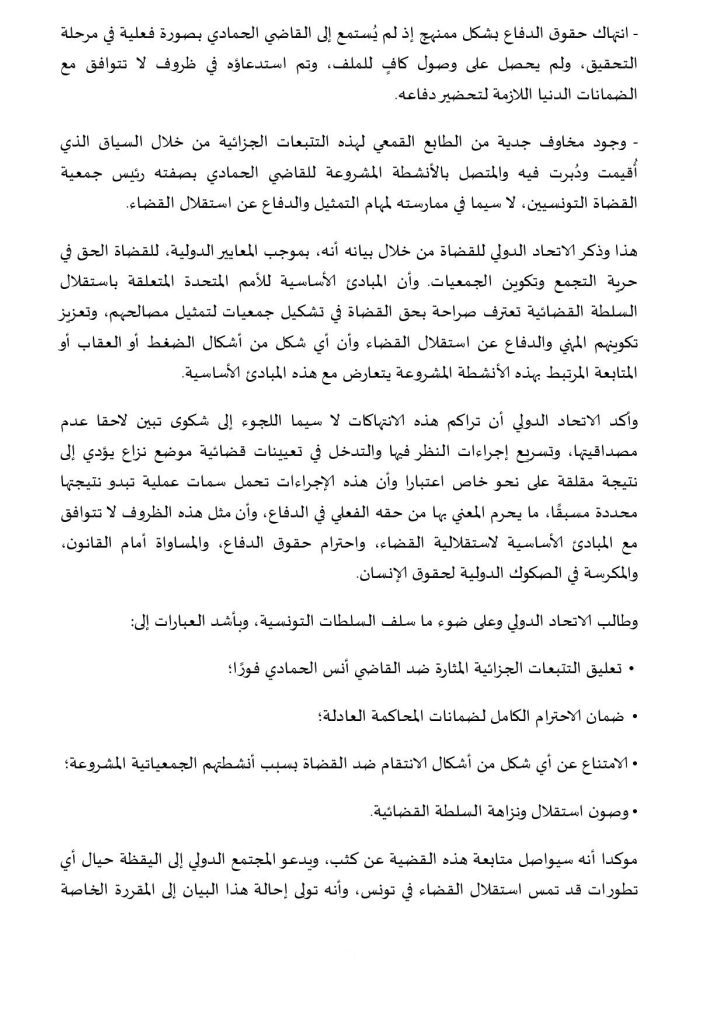 وأكد الاتحاد الدولي أن تراكم هذه الانتهاكات لا سيما اللجوء إلى شكوى تبين لاحقا عدم مصداقيتها، وتسريع إجراءات النظر فيها والتدخل في تعيينات قضائية موضع نزاع يؤدي إلى نتيجة مقلقة على نحو خاص اعتبارا وأن هذه الإجراءات تحمل سمات عملية تبدو نتيجتها محددة مسبقًا، ما يحرم المعني بها من حقه الفعلي في الدفاع، وأن مثل هذه الظروف لا تتوافق مع المبادئ الأساسية لاستقلالية القضاء، واحترام حقوق الدفاع، والمساواة أمام القانون، والمكرسة في الصكوك الدولية لحقوق الإنسان.
