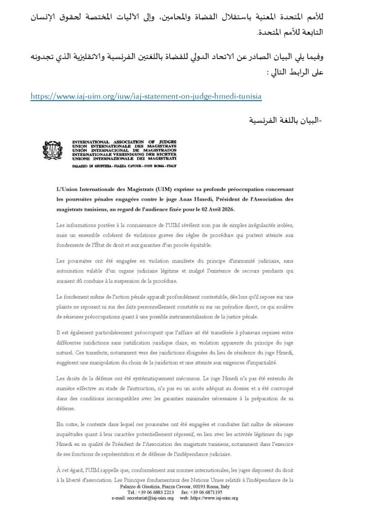 كما أكد أنه سيواصل متابعة هذه القضية عن كثب، داعيا المجتمع الدولي إلى اليقظة حيال أي تطورات قد تمس استقلال القضاء في تونس، مشيرا الى أنه تولى إحالة هذا البيان إلى المقررة الخاصة للأمم المتحدة المعنية باستقلال القضاة والمحامين، وإلى الآليات المختصة لحقوق الإنسان التابعة للأمم المتحدة.