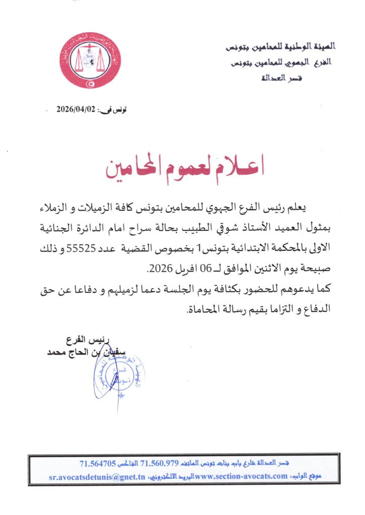 ودعا الفرع الجهوي للمحامين بتونس في بيان له، كافة منظوريه للحضور بكثافة لمساندة زميلهم، ودفاعا عن حق الدفاع والتزاما بقيم رسالة المحاماة.