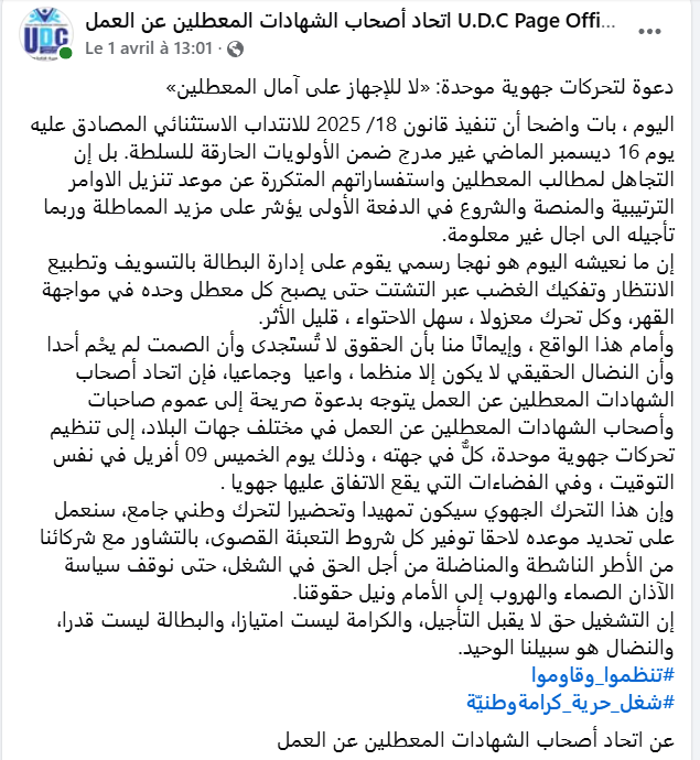 وأضاف الاتحاد في بيان له أنه “بات واضحا أن تنفيذ قانون 18/ 2025 للانتداب الاستثنائي المصادق عليه يوم 16 ديسمبر الماضي غير مدرج ضمن الأولويات الحارقة للسلطة” معتبرا أن “التجاهل لمطالب المعطلين واستفساراتهم المتكررة عن موعد تنزيل الأوامر الترتيبية والمنصة والشروع في الدفعة الأولى يؤشر على مزيد المماطلة وربما تأجيله الى أجل غير معلومة”.