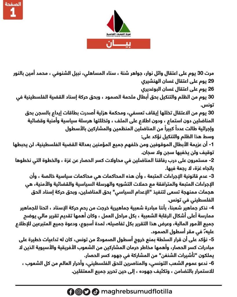 وتوجهت الهيئة بالشكر الى الشعب التونسي الذي استجاب أمس لنداءات “اللجنة الوطنية للدفاع عن نشطاء أسطول الصمود والحق الفلسطيني” ونداءات القوى الحية و الداعمة للحق الفلسطيني في تونس، عبر المسيرة الاحتجاجية التي جابت شوارع العاصمة تونس.