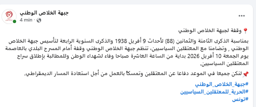 دعت جبهة الخلاص الوطني إلى المشاركة في وقفة احتجاجية يوم الجمعة 10 أفريل 2026 أمام المسرح البلدي بالعاصمة بمناسبة الذكرى الثامنة والثمانين (88) لأحداث 9 أفريل 1938 والذكرى السنوية الرابعة لتأسيس جبهة الخلاص الوطني , وتضامنا مع المعتقلين السياسيين.