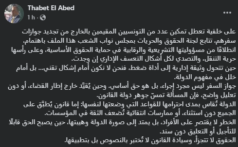 وشدّد العابد، في تدوينة على فيسبوك، على أنه “حين تتحول وثيقة إدارية إلى أداة ضغط، فنحن لا نكون أمام إشكال تقني… بل أمام خلل في مفهوم الدولة”.