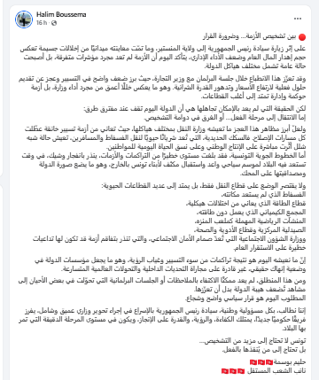 طالب النائب بالبرلمان حليم بوسمة رئيس الجمهورية بإجراء تحوير وزاري عميق وشامل قائلا: نطالب، بكل مسؤولية وطنية، رئيس الجمهورية بالإسراع في إجراء تحوير وزاري عميق وشامل، يفرز فريقًا حكوميًا جديدًا، يمتلك الكفاءة، والرؤية، والقدرة على الإنجاز، ويكون في مستوى المرحلة الدقيقة التي تمر بها البلاد.
