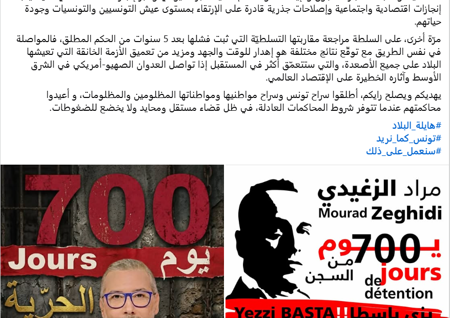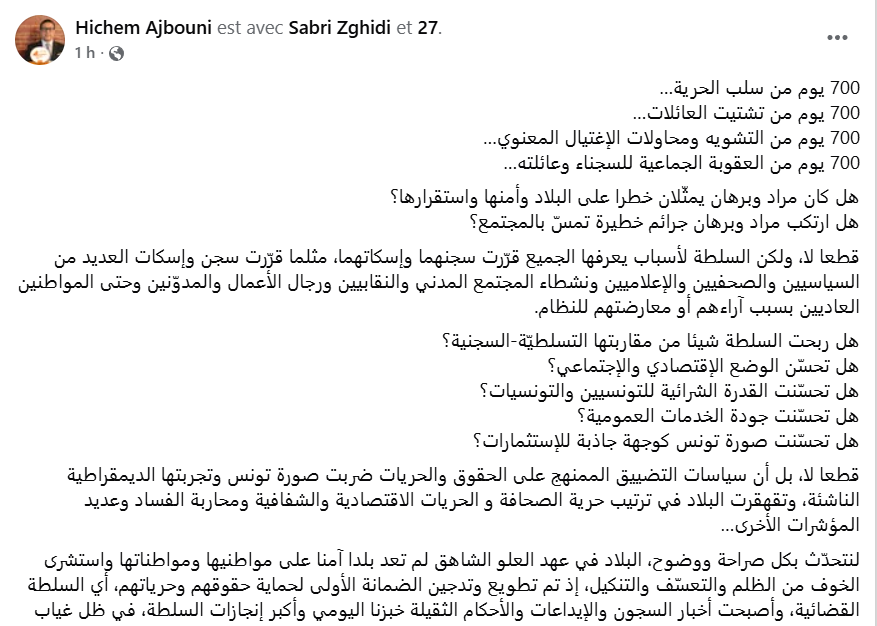 وشدد العجبوني، بمناسبة مرور 700 يوما على اعتقال الصحفي مراد الزغيدي والاعلامي برهان بسيس، على أن “السلطة لأسباب يعرفها الجميع قرّرت سجنهما وإسكاتهما، مثلما قرّرت سجن وإسكات العديد من السياسيين والصحفيين والإعلاميين ونشطاء المجتمع المدني والنقابيين ورجال الأعمال والمدوّنين وحتى المواطنين العاديين بسبب آراءهم أو معارضتهم للنظام”، وفق قوله.