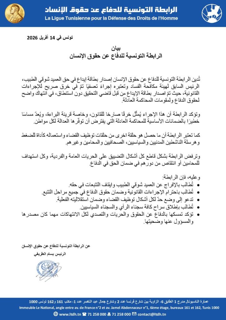 أدانت الرابطة التونسية للدفاع عن حقوق الإنسان إصدار بطاقة إيداع في حق العميد شوقي الطبيب، الرئيس السابق لهيئة مكافحة الفساد معتبرة أنه إجراءً تعسفيًا تمّ في خرق صريح للإجراءات القانونية.