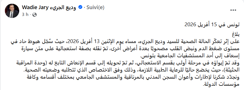 ويوم 9 مارس الماضي تم نقل الجريء إلى قسم الإنعاش القلبي بأحد مستشفيات العاصمة لتلقي العلاج بسبب تدهور وضعه الصحي، قبل أن يُعاد إلى السجن المدني بالمرناقية، حيث يواصل متابعة حالته الصحية في ظروف دقيقة تستوجب رعاية مستمرة.
