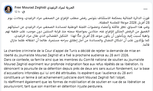 عبرت لجنة مساندة الصجفي مراد الزغيدي عن استيائها العميق من الرفض المتكرر للإفراج عنه، مندّدة بمواصلة سجنه منذ قرابة السنتين دون موجب.