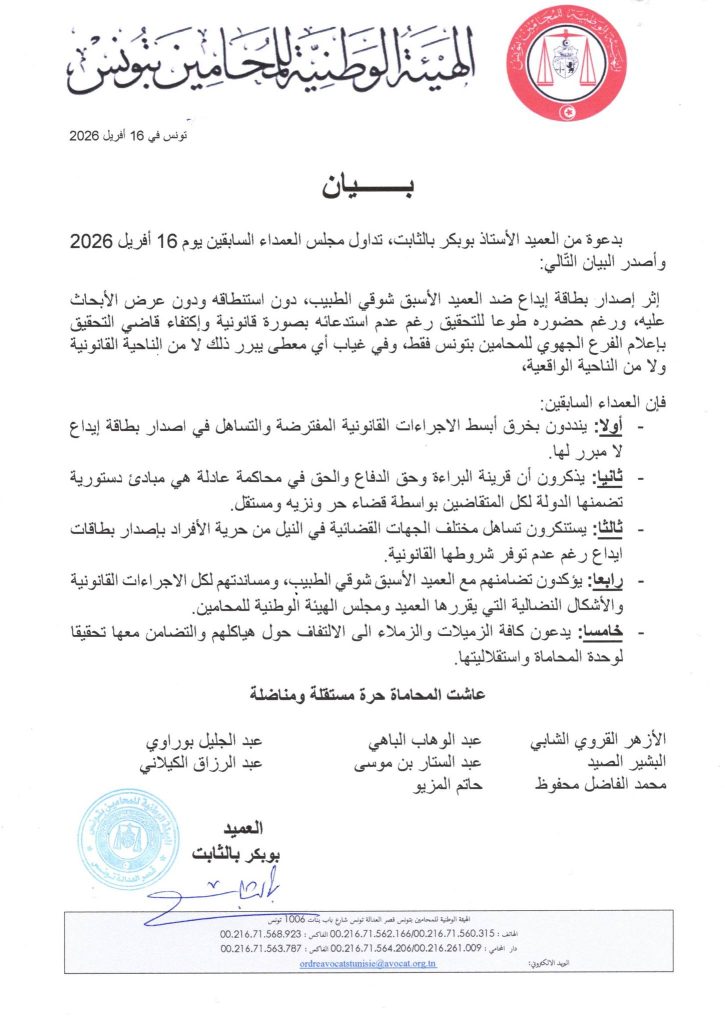 عبر عمداء سابقين للهيئة الوطنية للمحامين بتونس، اليوم الخميس 16 أفريل 2026، عن تضامنهم مع العميد الأسبق شوقي الطبيب، ومساندتهم لكل الإجراءات القانونية والأشكال النضالية التي يقررها العميد ومجلس الهيئة الوطنية للمحامين.
