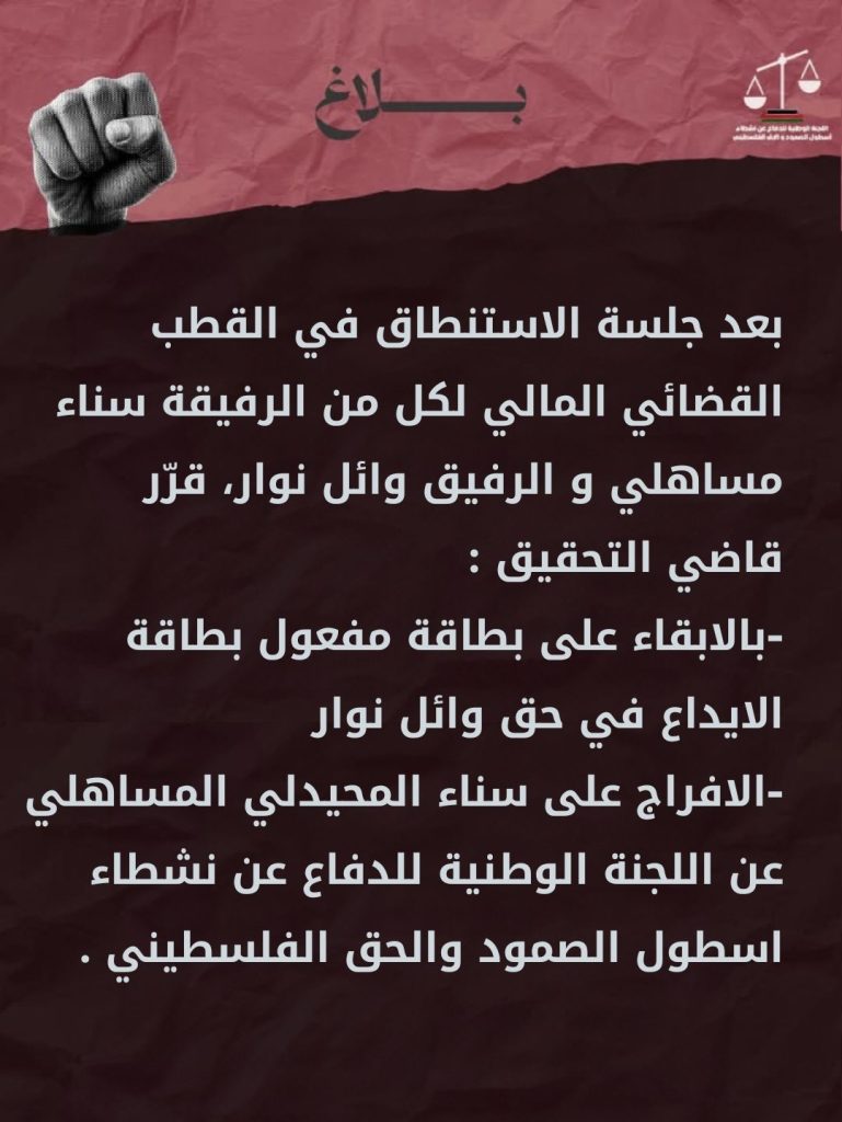 وكان قد تم اليوم استنطاق كل من سناء المساهلي ووائل نوار فيما يتعلق بقضية أسطول الصمود.