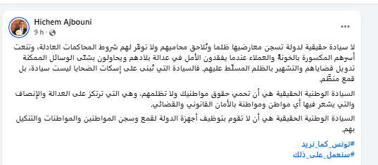 قال الأمين العام لحزب التيار الديمقراطي هشام العجبوني إنه لا سيادة حقيقية لدولة تسجن معارضيها ظلما وتُلاحق محاميهم ولا توفّر لهم شروط المحاكمات العادلة، وتنعت أسرَهم المكسورة بالخونةً والعملاء عندما يفقدون الأمل في عدالة بلادهم ويحاولون بشتّى الوسائل الممكنة تدويل قضاياهم والتشهير بالظلم المسلّط عليهم.