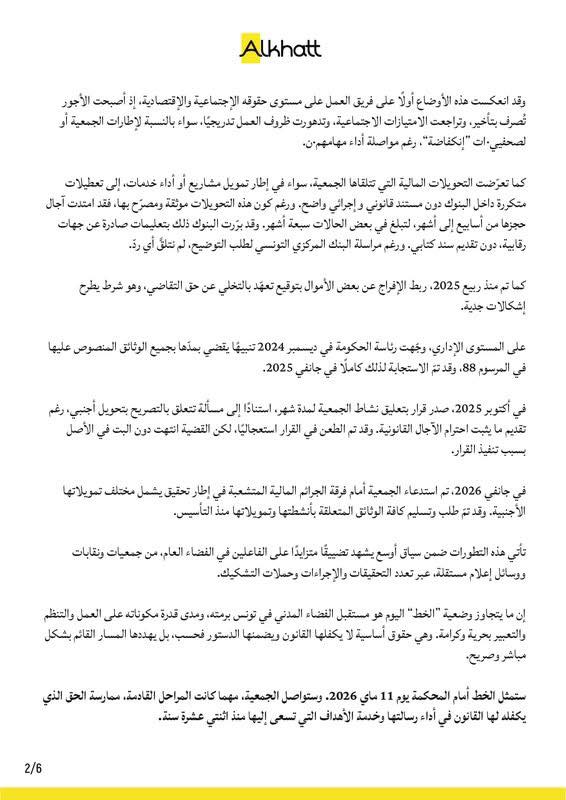 أفادت جمعية "الخط"،بأنّ المحكمة الابتدائية بتونس، تنظر يوم 11 ماي 2026، في طلب تقدّمت به رئاسة الحكومة يقضي بحلّ الجمعية.