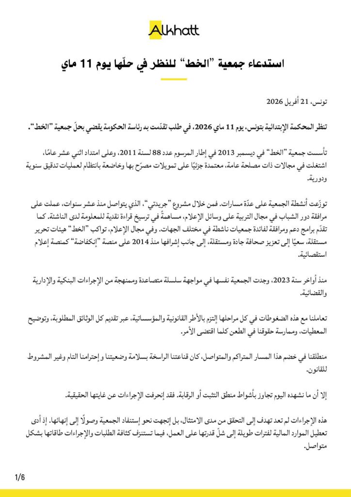 أفادت جمعية “الخط”،بأنّ المحكمة الابتدائية بتونس، تنظر يوم 11 ماي 2026، في طلب تقدّمت به رئاسة الحكومة يقضي بحلّ الجمعية.