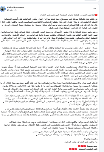 وتابع النائب بالبرلمان حليم بوسمة في تدوينة نشرها على صفحته بالفيسبوك: اليوم، لم يعد مقبولًا الاكتفاء بإدارة الأزمة، بل أصبح من الضروري إعادة رسم طريق واضح يقوم على تحرير الاستثمار، وتجديد النخب، والقيام بتحوير وزاري شامل يضخّ كفاءات قادرة على العمل بآليات حديثة، لأنّ استمرار نفس الأساليب لن ينتج إلا نفس النتائج.