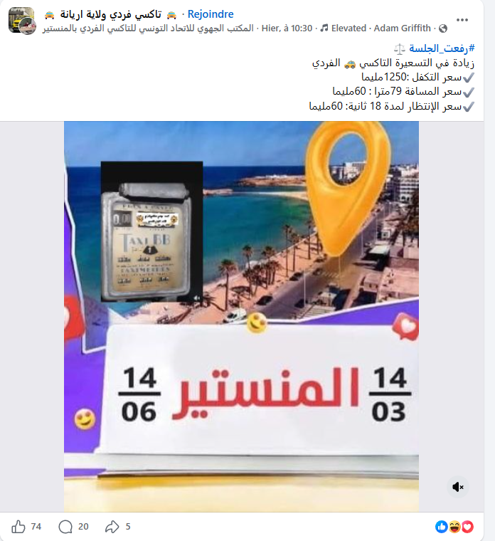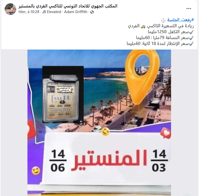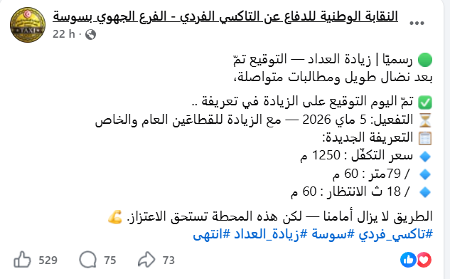 ونشرت صفحة “النقابة الوطنية للدفاع عن التاكسي الفردي فرع سوسة”، بيانا مساء أمس الخميس أكدت من خلاله أن تم رسميا الزيادة في تعريفة العداد الى 1250م وسيتم تفعيل هذا القرار بداية من 5 ماي المقبل.