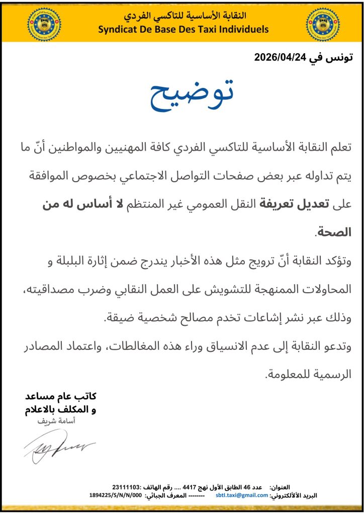 وفي مرحلة ثانية وبالرجوع الى الصفحة الرسمية للنقابة الأساسية للتاكسي الفردي، عثرنا على بيان صادر عنها بتاريخ اليوم الجمعة 24 أفريل 2026، أكدت من خلاله أنّ ما يتم تداوله عبر بعض صفحات التواصل الاجتماعي بخصوص الموافقة على تعديل تعريفة النقل العمومي غير المنتظم لا أساس له من الصحة.
