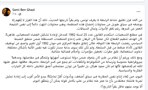 و اعتبر سامي بن غازي في تدوينة نشرها على صفحته بالفيسبوك أنه “حين يُعاد إنتاج المقاربة نفسها في سياق أضعف، وبأدوات أقلّ تماسُكاً، يبدو الأمر أقرب إلى إعادة تمثيل تجربة فاشلة”، معتقدا أنّ “ما عجز عنه نظام بن علي بكامل قوته يمكن أن يتحقّق اليوم”.