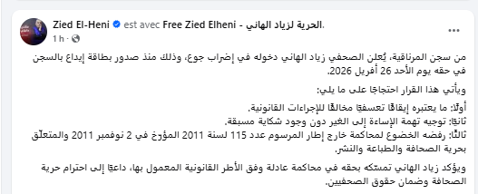 أعلن الصحفي زياد الهاني عن دخوله في إضراب جوع، وذلك منذ صدور بطاقة إيداع بالسجن في حقه يوم الأحد 26 أفريل 2026.