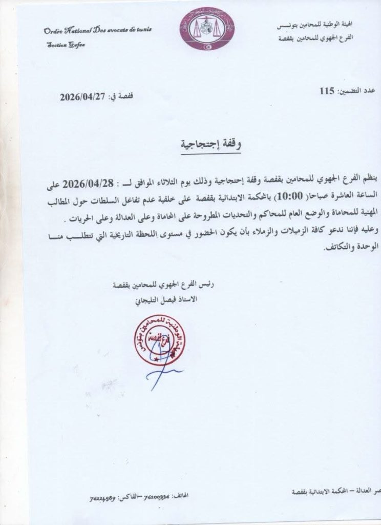 دعا الفرع الجهوي للمحامين بقفصة، اليوم الإثنين 27 أفريل 2026، منظوريه الى المشاركة في وقفة احتجاجية غدا الثلاثاء على الساعة العاشرة صباحا أمام المحكمة الابتدائية.
