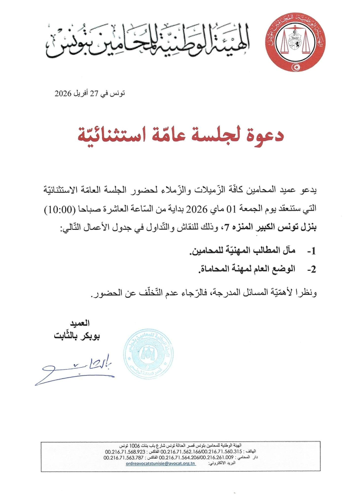 من جهتها، دعت الهيئة الوطنية للمحامين بتونس، اليوم الاثنين 27 أفريل في بيان لها، كافة المحامين لحضور الجلسة العامة الاستثنائية التي ستنعقد يوم الجمعة 1 ماي وذلك للنقاش والتداول في مآل المطالب المهنية للمحامين والوضع العام لمهنة المحاماة.